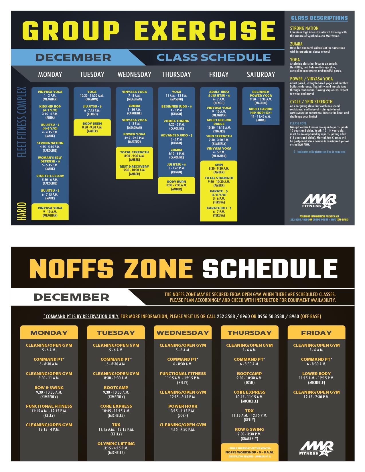 - Group Exercise classes (click for Schedule) at Main Base and Hario Gym's